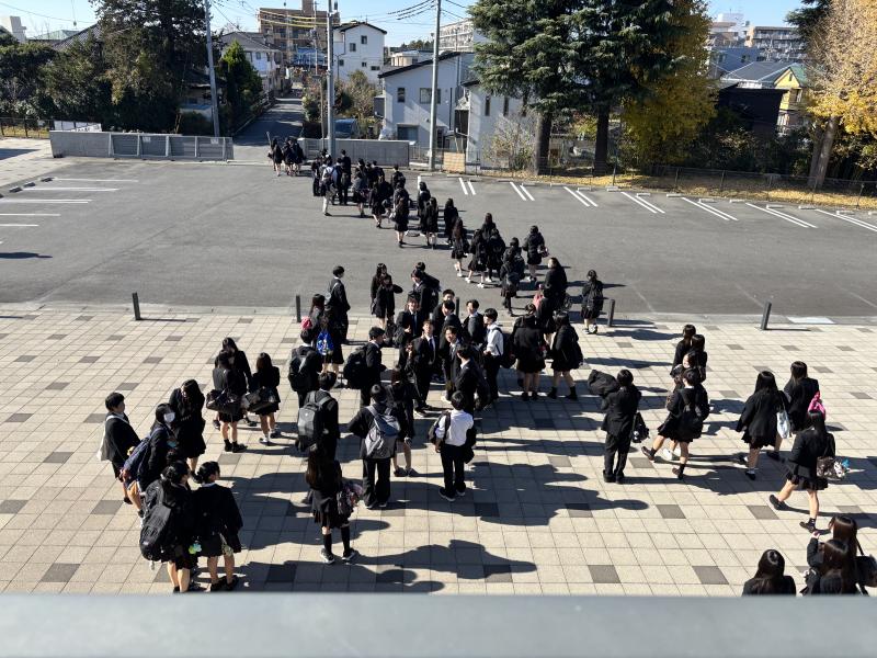 昇降口付近に、続々集まる2年生。これからバスでつくばの国際会議場に向かいます。校外での進路学習、皆さん楽しみにしているようです。いってらっしゃい!