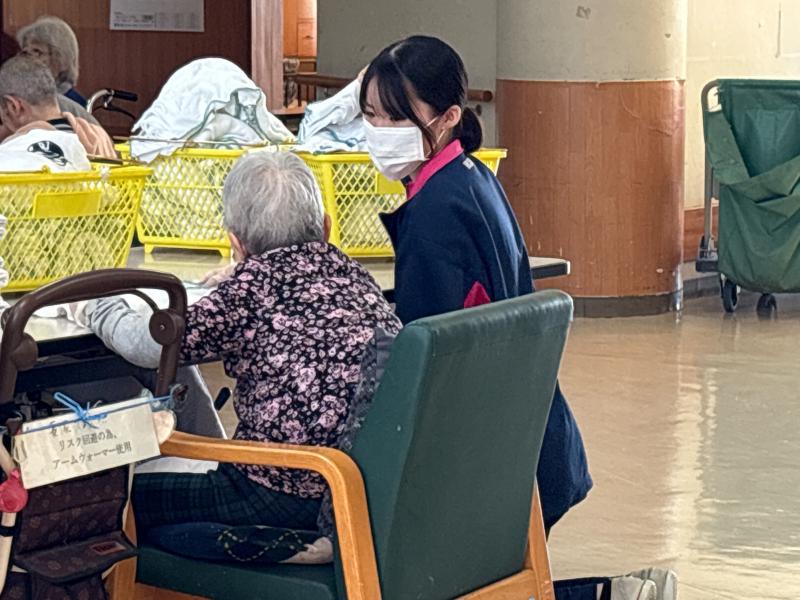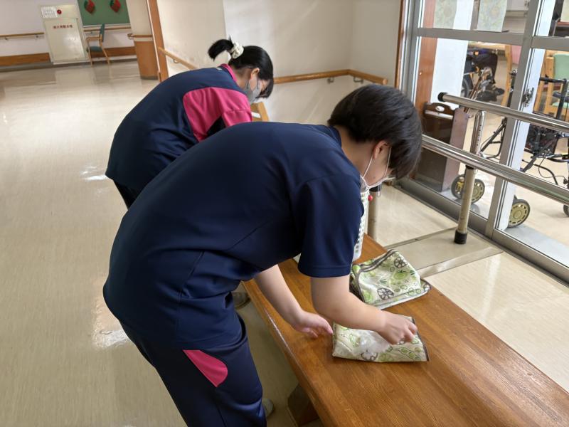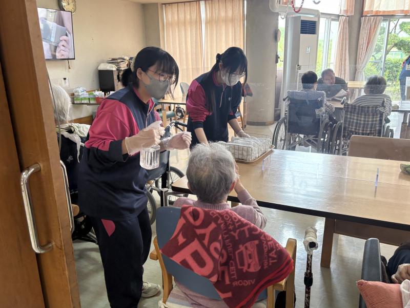 3日間の実習では、利用者様とコミュニケーションを取りながら軽作業を一緒に行わせていただいたり、入浴後の髪をドライヤーで乾かさせていただいたり、食事前の手指消毒や配膳・下膳をお手伝いさせていただきました。