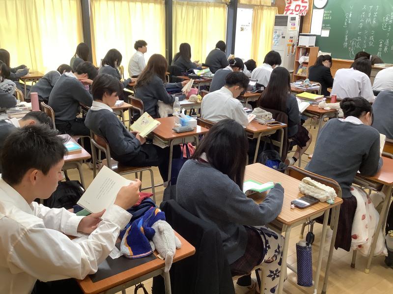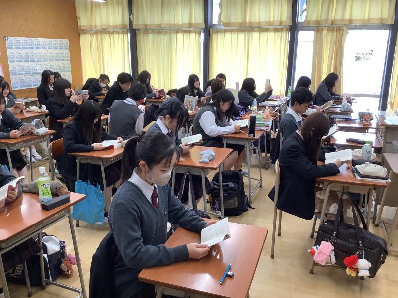 全校一斉読書とは、図書委員会主催の学校行事です。校内において生徒と先生が共に読書をする時間を設けることで、読書への意識を高めるとともに読書に親しむ態度を育成しています。