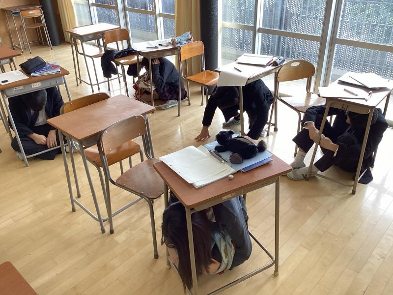わずか1分程度の短い訓練でしたが、生徒一人ひとりが「もしもの時」に備え、時間や場所を選ばずに即座に身の安全を確保する行動をとる習慣を身につけるための、極めて重要な意識付けの機会となりました。
