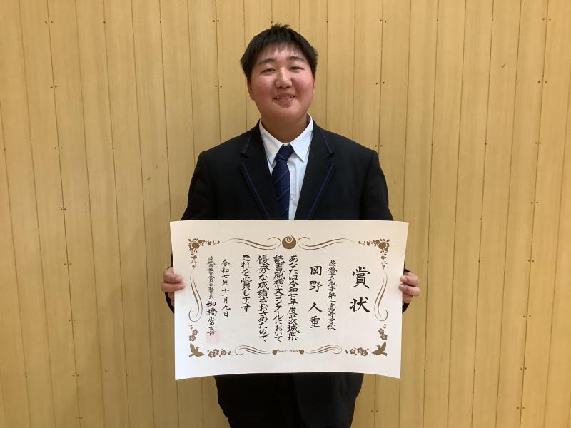 1年岡野人重さんが、第71回青少年読書感想文全国コンクール茨城県高等学校の部で、応募数47校、114作品の中から、優秀賞(県教育長賞)を受賞しました。