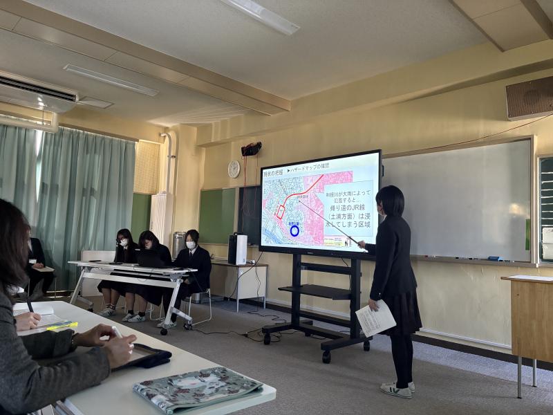 1学年時のSDGs校外学習で臨海広域防災公園を訪れたことをきっかけに、利根川が近くを流れる取手二高の地理的特徴を踏まえ、自分たちに最も起こりうる災害として洪水・大雨被害に着目し、その対策について研究を進めました。