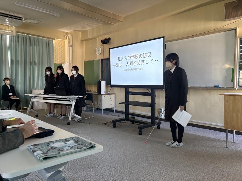 有志5名が「私たちの学校の防災 〜洪水・大雨を想定して〜」をテーマに探究活動を行い、その成果を潮来高校にて発表しました。