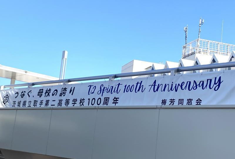 取手駅に横断幕登場!100周年式典に華を添えてくれます。