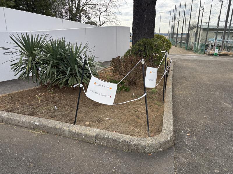 花いっぱい運動!と銘打ってチューリップの球根を植えました 花壇に足を踏み入れないように ということで、心ある生徒(先生か?)が、防御柵を作ってくれました 愛ある気持ちに守られて春になるころ花が咲くといいですね